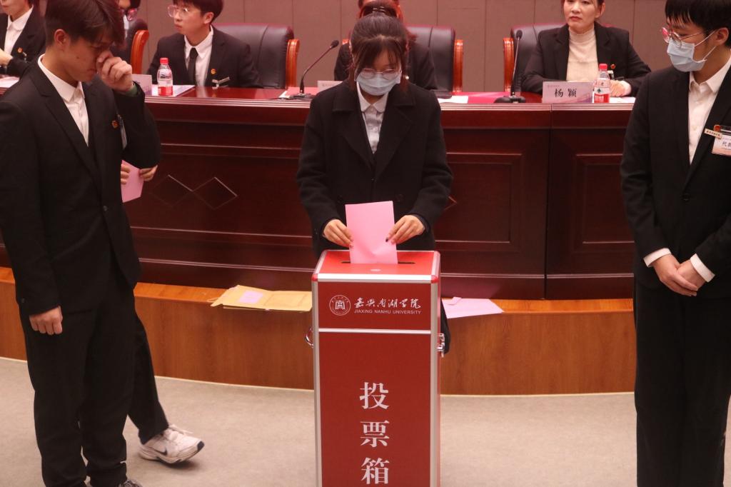 在会议审议通过《共青团嘉兴南湖学院代表会议选举办法(草案)》、《共青团嘉兴南湖学院代表会议监票组、计票组名单(草案)》、《共青团嘉兴市第九次代表大会代表候选人名单(草案)》后,会议选举正式进行。经过代表们热烈讨论,选举出三位代表嘉兴南湖学院出席共青团嘉兴市第九次代表大会。