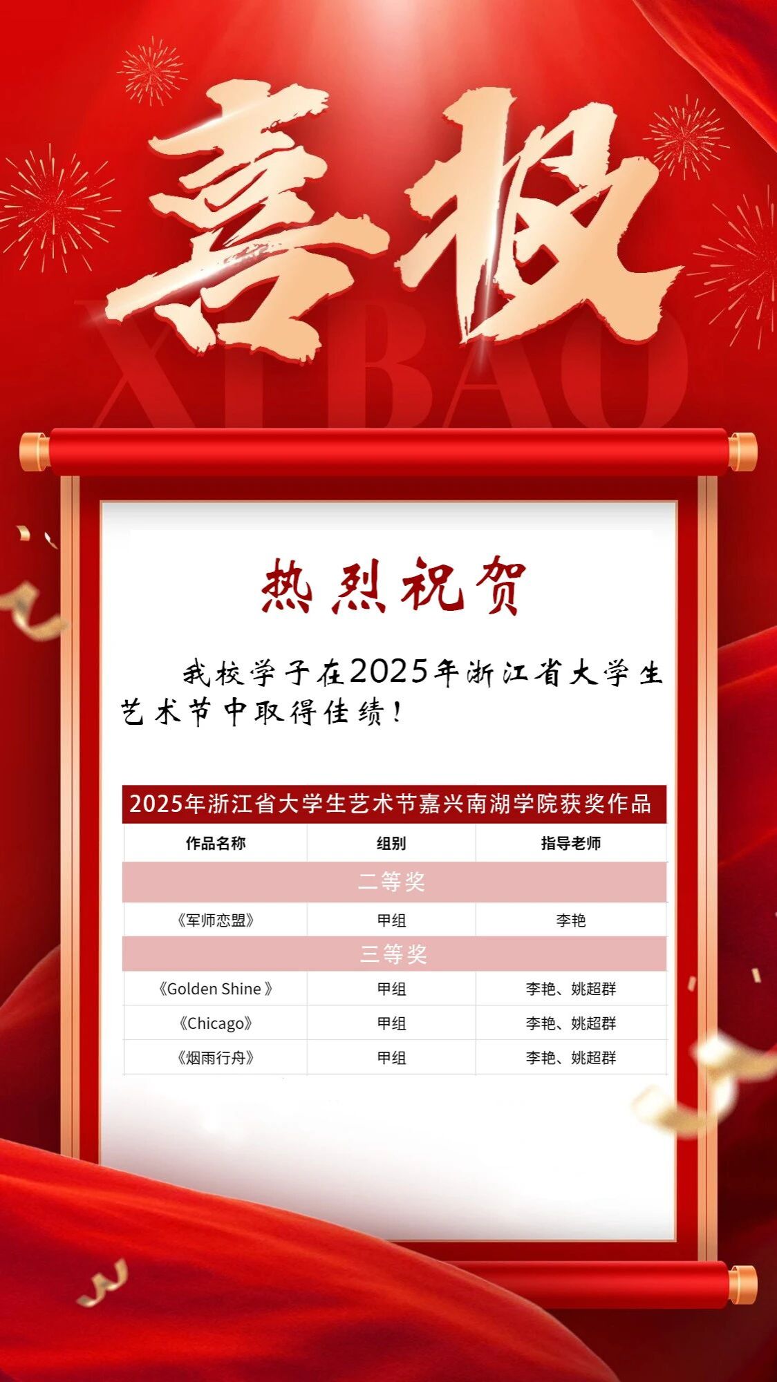近期,2025年浙江省大学生艺术节落幕。本届艺术节以“民族魂·中国梦”为主题,共收到来自全省102所高校选送的器乐、声乐及十佳歌手节目712个,其中160个节目进入现场展演。我校选送的参赛作品荣获4个奖项,其中二等奖1项、三等奖3项。